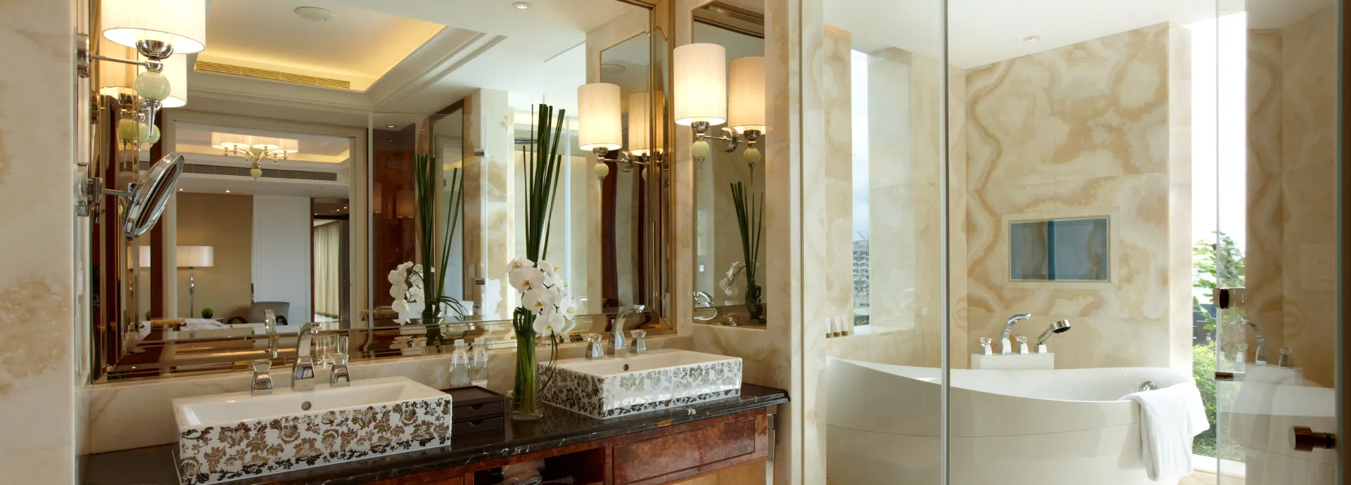 The European separate bathtub offers guests the amusement of landscaped garden views with a sense of relaxation from the busy city.